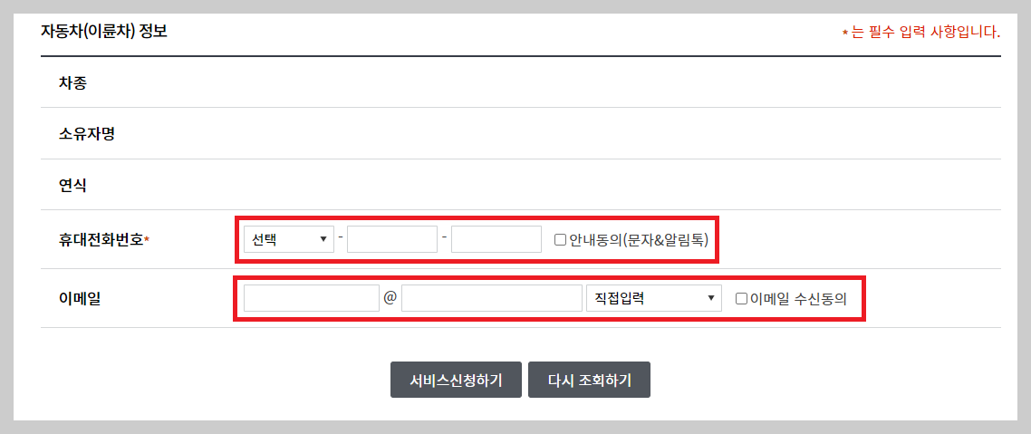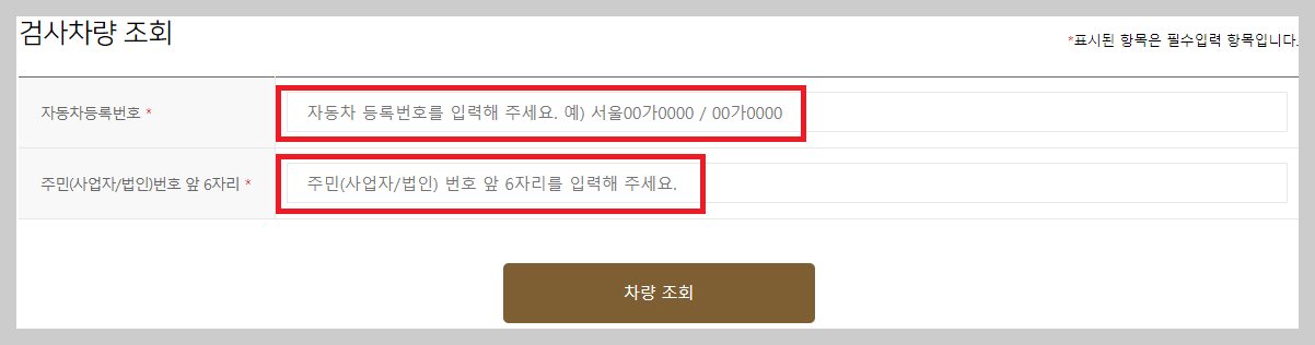 4. 자동차 번호 및 주민번호 앞 6자리 입력 후 조회