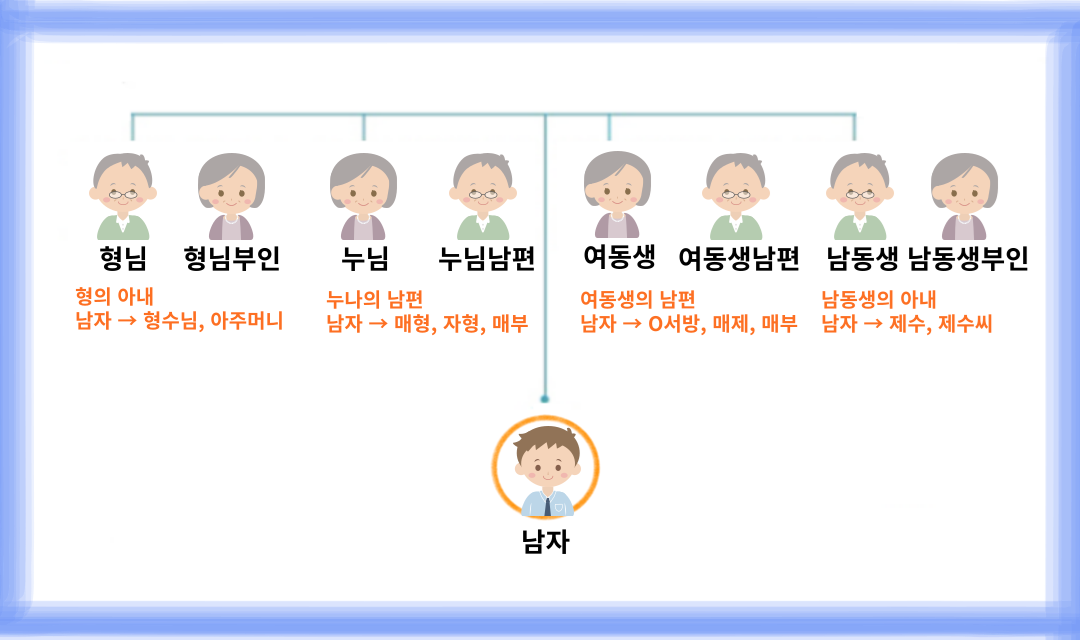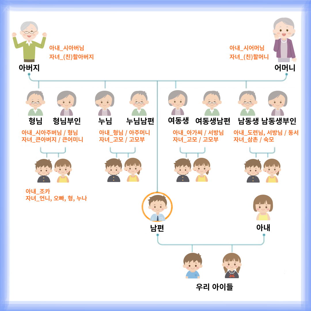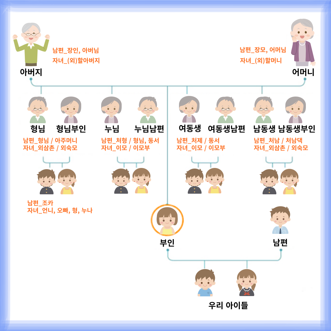 이번 명절에 가족들이 모이는 새로운 분을 만나나요? 자주 보는 분이 아니기에 뭐라고 불러야 할지 모르겠죠? 만나기 전에 호칭을 알아두면 겁날 것이 없답니다. 시댁, 친정 어디를 가든 미리미리 알아두면 당당해 집니다.